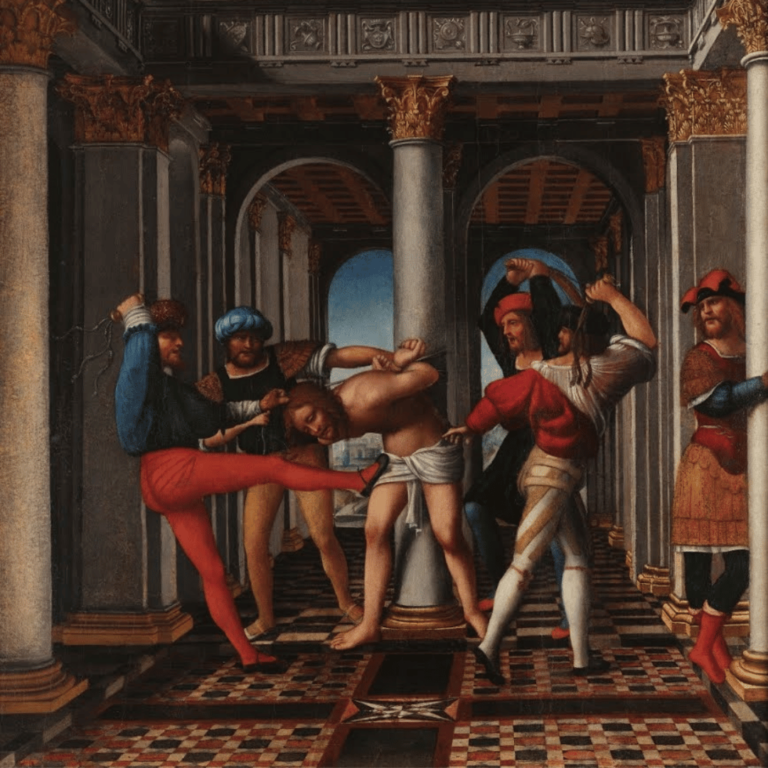 The sheer wickedness, the foul perfidy. Christ's torturers evoke the bloodiest scenes of a Tarantino film. Virgins, scourges and whips are used on the poor body, but that's not all: the man in the red trousers, in order to hit him with more force, points his foot against the thigh of the condemned man and pulls his hair with