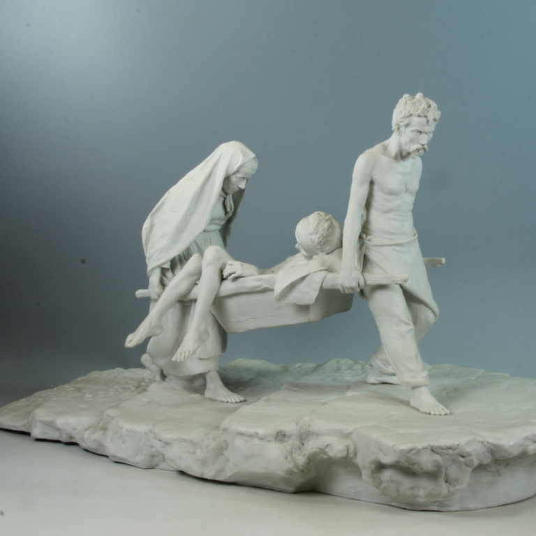 The work of fine white biscuit is like a secular Pietà, a wounded young worker is carried lying, bloodless, in a wheelbarrow. We cannot remain indifferent to the face of the mother who is bent over in her effort to carry her son to safety, she seems to have no time to suffer, to ache, she must use every muscle to help him. The other stretcher-bearer, could be the father or an older colleague, also carries the boy but his gaze is sceptical and he fears, in his heart, that the young man will not survive and that all is in vain.
