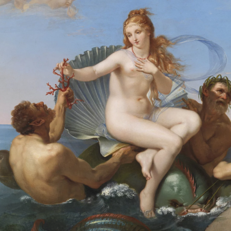 In 1818, the Count from Brescia Paolo Tosio commissioned Bezzuoli to make a large copy of the School of Athens by Raphael, frescoed in the Vatican Stanze. In October 1819, Bezzuoli informed the Count that the work had been sent, including one of his own original creations, The Birth of Venuswith the intention of introducing his personal style as well as his skills as a copyist. The painting draws inspiration from the Triumph of Galatea by Raphael at the Farnesina, depicting a female figure advancing on a shell, surrounded by tritons and dolphins, under a clear sky animated by putti. The composition is distinguished by a cool light and a brilliant, almost enamelled colour scheme, reflecting the style of French painting of the time and details of refined elegance, such as the coral branch offered to the goddess by a triton.