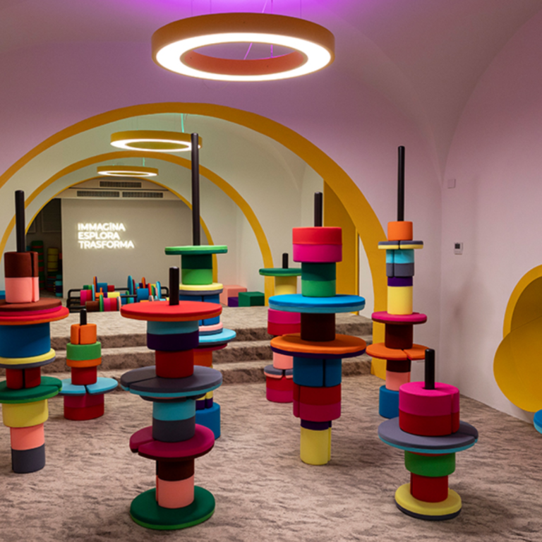 È a 400 m2 space organised in five rooms. Some art installations, exploration, play and construction activities allow you to immerse yourself in the first four rooms where art and science come together in entertaining activities. Each participant, with the help of the museum's educational staff, can explore the shapes, materials and sounds of nature, use their imagination and storytelling to learn about surprising historical objects from the collections, build a fantasy world with many deconstructed materials, and play with light and shadows between the analogue and digital worlds.