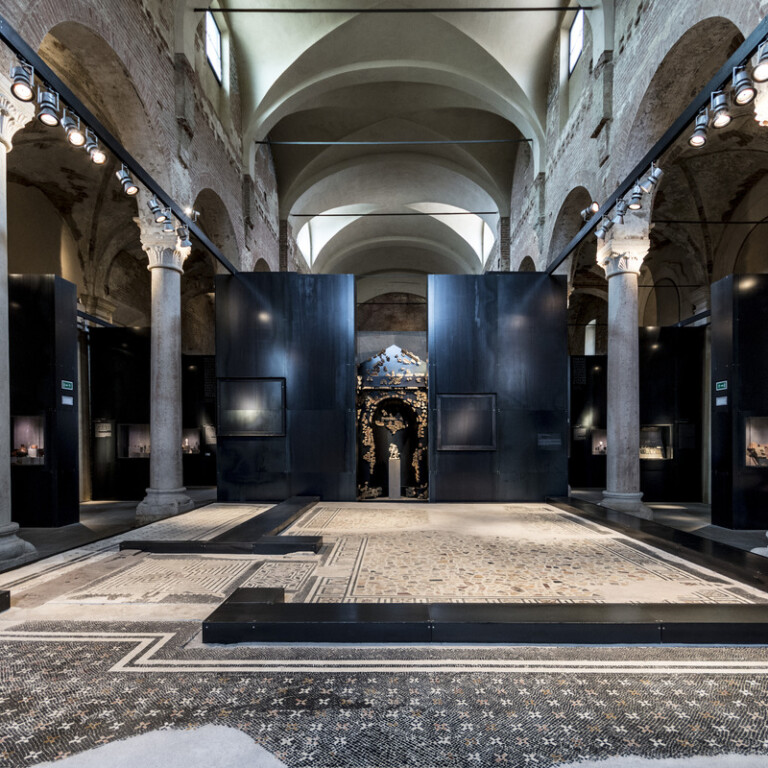 More than 500 objects are exhibited according to a thematic itinerary divided into three sections: the public space, where the monumental remains of the building, perhaps to be identified with the theatre, located at what is now Via Cesare Battisti, the private space, witnessed by the rich domus of the Labyrinth from Via Cadolini, the Nymphaeum from Piazza Marconi and Via Colletta, and the necropolis, with parts of monuments and grave goods.