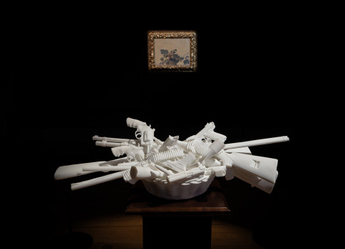 Protagonista del confronto è la celeberrima Canestra di frutta di Caravaggio, conservata nella collezione del museo, messa in relazione con una scultura potente e provocatoria di Jago: una cesta non più di frutti, ma colma di armi. Pistole, fucili e mitragliatori scolpiti nel marmo, simbolo eterno della tradizione artistica italiana, diventano metafora del presente, denunciando una realtà in cui la violenza è diventata parte integrante del nostro quotidiano.