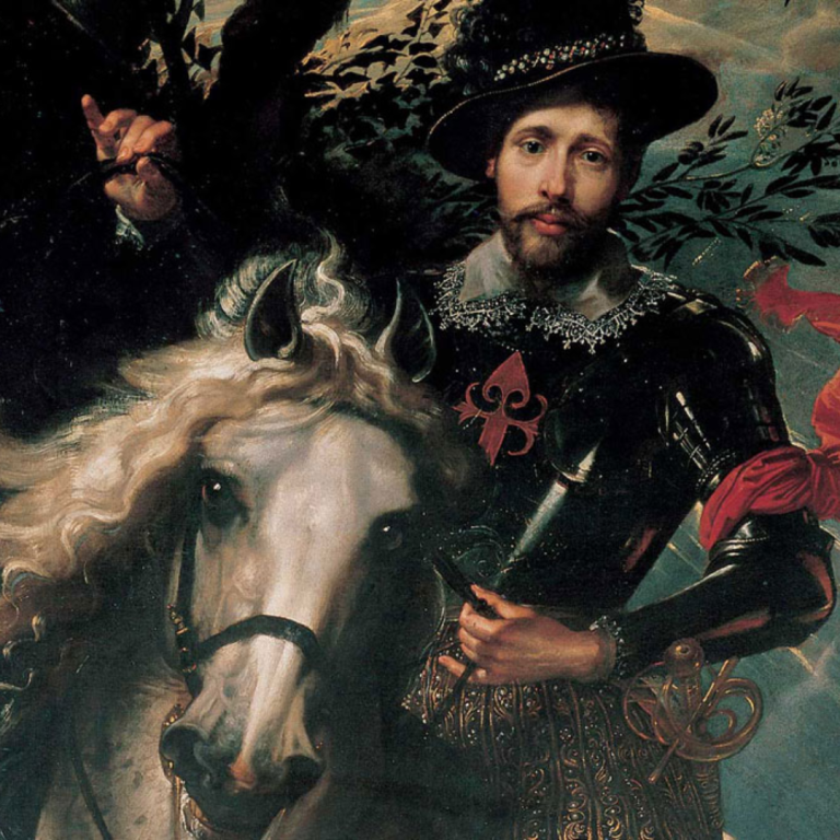 Il dipinto, eseguito intorno al 1607, ritrae Giovan Carlo Doria, esponente di spicco dell’aristocrazia genovese, noto per il suo ruolo di mecenate e per i suoi rapporti con i principali artisti dell’epoca. Rubens, nel pieno della sua esperienza italiana, restituisce un’immagine di potere e autorevolezza, dominata da una composizione dinamica: il nobile in armatura, a cavallo, è accompagnato da un cane, simbolo di fedeltà e nobiltà, in un’atmosfera carica di energia e teatralità. L’opera celebra ambizione, status sociale e autorità, esaltando la figura del committente attraverso l’uso magistrale del colore, della luce e del movimento.