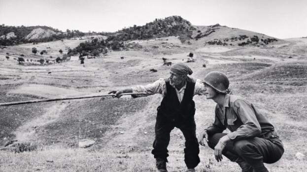 A Sicilian peasant telling an American officer which way the Germans had gone, near Troina in Sicily, Italy, August, 1943.