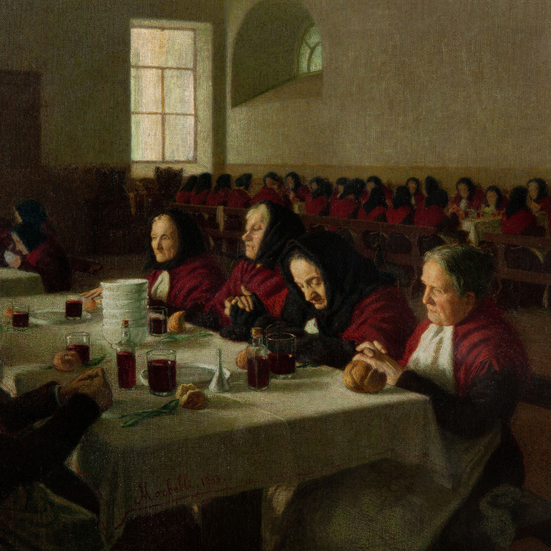 La signora Gina, illuminata da un raggio di sole, ha le dita conserte e sta aspettando, tra un bicchiere di vino rosso e una michetta, che le venga servita la zuppa. In quella indistinta tavolata di donne vestite tutte uguali, lei è tra le poche a non indossare il foulard nero che fa parte della divisa delle ospiti.